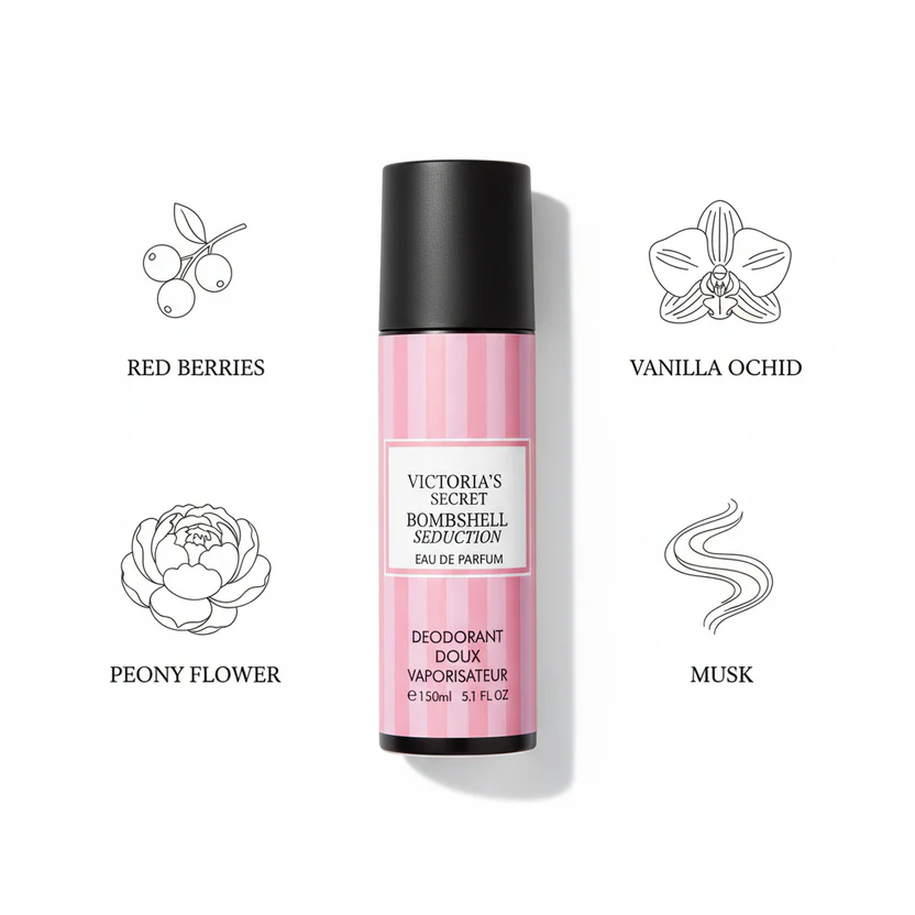 Experience the captivating allure of Victoria’s Secret Bombshell Seduction Deodorant Doux – a gentle deodorant spray infused with the iconic Bombshell Seduction Eau de Parfum fragrance. This 150ml deodorant provides all-day freshness with the seductive floral-fruity scent that embodies American glamour, feminine confidence, and irresistible charm.