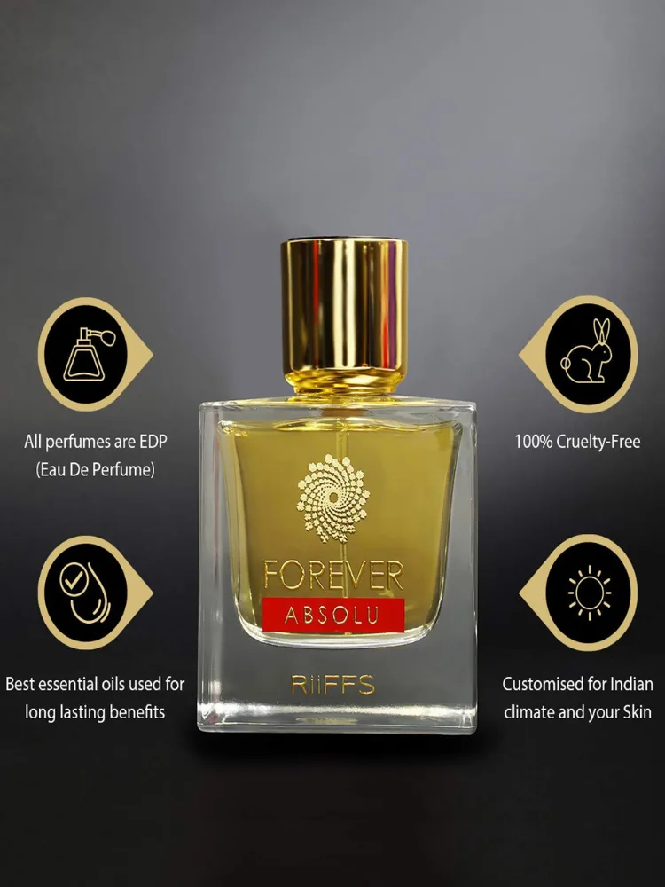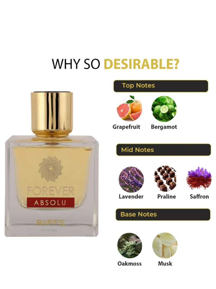 Forever Absolu Riiffs is a refined, long-lasting fragrance combining rich floral and warm amber notes. Smooth and elegant, it offers depth with subtle sweetness and a sensual, sophisticated finish. Perfect for daily wear or special occasions, this perfume evokes timeless charm, confidence, and unforgettable allure.